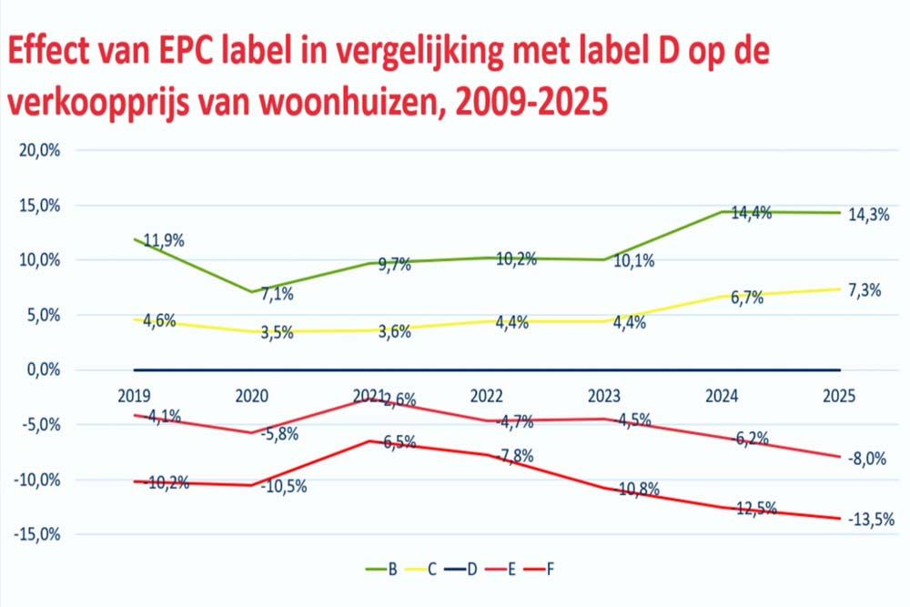 Ondanks het feit dat huizen met de slechtste EPC-labels dus opnieuw in prijs stijgen, groeit de kloof wel tussen de labels C en D en de labels E en F in vergelijking met 2024. Een woning met label F is 13,5% goedkoper dan een woning met label D, de huidige norm. Voor een woning met label E betaal je gemiddeld 8% minder. Een woning met label C daarentegen is 7,3% duurder, een label B kost 14,3% meer en de meest energiezuinige panden met label A komen uit op 23,2% extra.