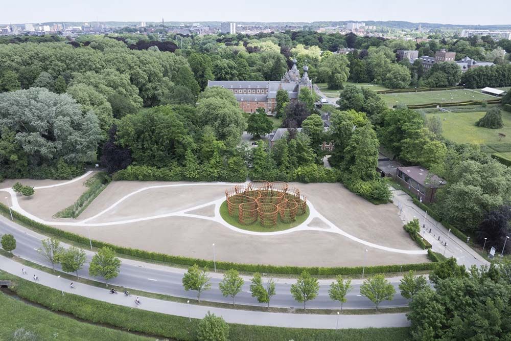 Het startpunt van de kunstroute is het kasteel van Arenberg in het zuiden van de stad. Dit kasteel uit de 16de eeuw is sinds de jaren ’20 van de vorige eeuw een mooie campus in klassiek Amerikaanse stijl. Als je vanuit het centrum van Leuven de bus neemt naar het kasteel kun je via de kunstroute in zo’n 5,5 kilometer terugwandelen naar de stad. Op een voormalige parkeerterrein naast de campus treffen we het eerste kunstwerk aan.