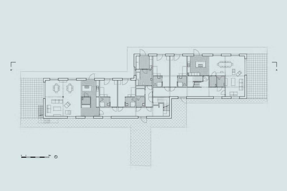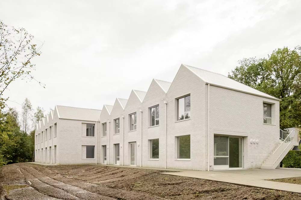 Architectenbureau Felt transformeerde een villa in Merksplas (BE) tot een woonzorggebouw voor mensen met psychische kwetsbaarheden. De bestaande constructie werd teruggebracht tot de dragende structuur van parallelle wanden, waarbij dak en afwerking verdwenen. Deze structuur vormde het uitgangspunt voor een nieuw plan met een gang die studio's met elkaar verbindt.