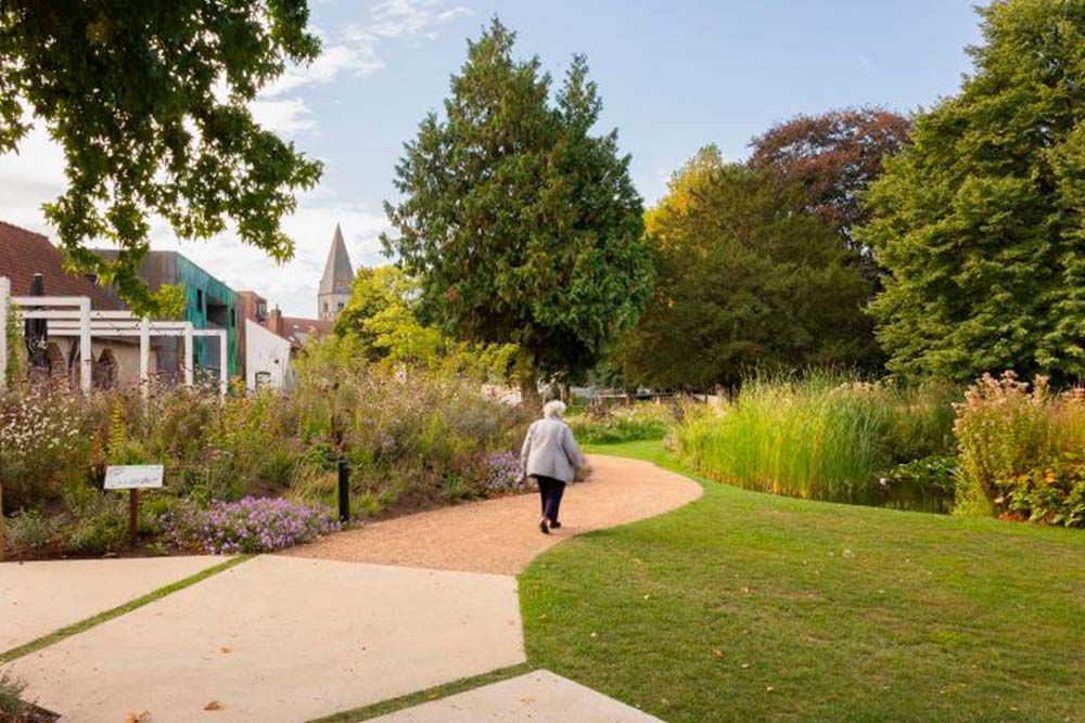 Tot voor enkele jaren was de tuin van het Torhoutse cultuurcentrum De Brouckere een groen eilandje in het stadscentrum. In de vorige legislatuur kreeg het stadsbestuur de kans om de nabijgelegen waardevolle en historische tuin ’s Gravenwinkel aan te kopen. Schepen Elsie Desmet, bevoegd voor Leefmilieu, Natuur, Parken en Bossen, Afvalbeleid, Dierenwelzijn, Mondiaal beleid, Begraafplaatsen, Toerisme en Onderwijs, legt uit: ‘Door ook een perceel tussen beide groengebieden aan te kopen kon een fysieke verbinding tussen de tuin De Brouckere en de tuin ’s Gravenwinkel worden gemaakt. De verwerving van het aanpalende gebouw van de FOD Financiën kort daarna, bood vervolgens de opportuniteit om de verschillende percelen tot een aaneengesloten groengebied in het stadscentrum te ontwikkelen. Deze stapsgewijze aanpak leidde tot de realisatie van een trage verbinding tussen de markt en het cultureel centrum.’ Die strategische aanpak kwam niet uit de lucht gevallen. An Wostyn, directeur Ruimte, blikt terug op wat voorafging: ‘Vanaf 2012 werden strategische sites op de kaart gezet bij de opmaak van een masterplan voor stadsvernieuwing, waaronder een aantal verborgen tuinen, al dan niet in eigendom van het stadsbestuur. Het masterplan stelde ons in staat om stelselmatig cruciale eigendommen aan te kopen wanneer de kans zich voordeed. Zo kon het stadsbestuur met subsidies van het Agentschap Onroerend Erfgoed, Stedenbeleid en VLAIO het Park De Brouckere realiseren.’