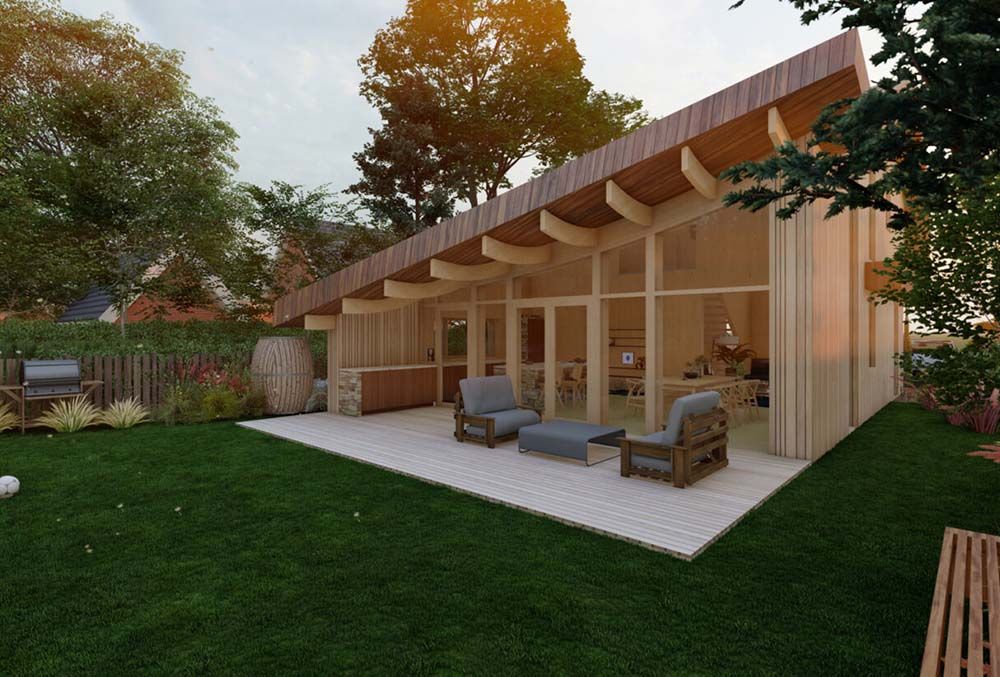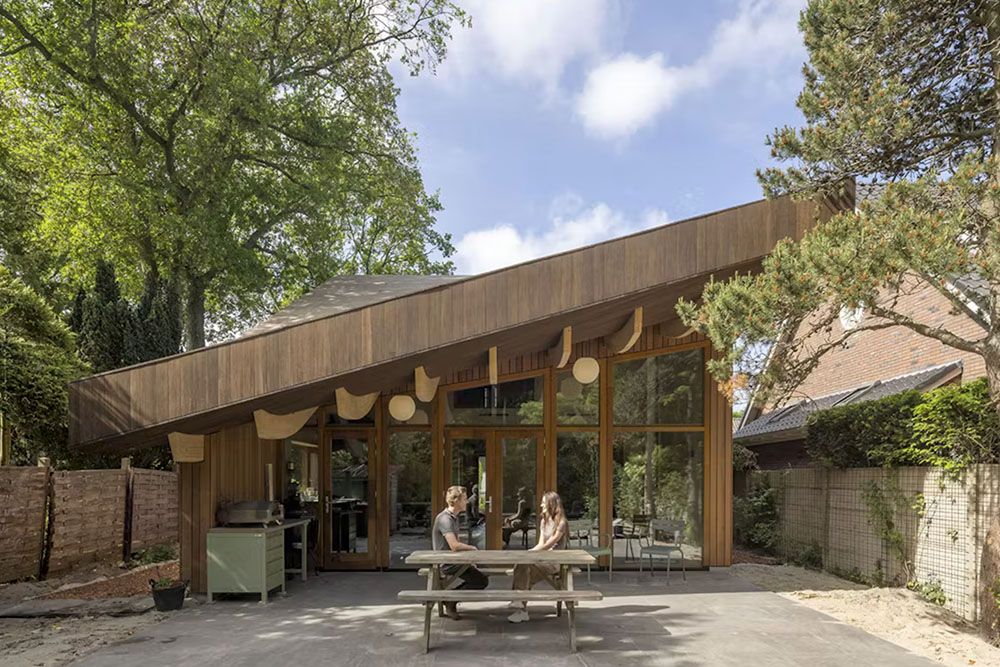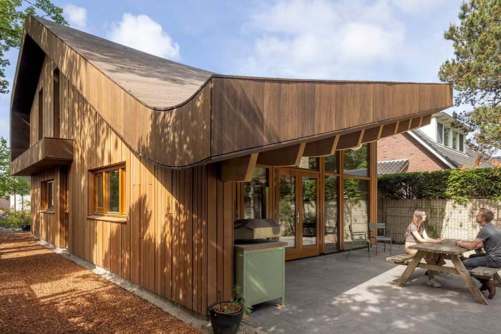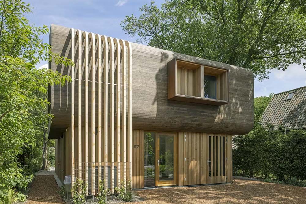 Aan de rand van het Heilooërbos in Heiloo, Noord-Holland (Nederland) heeft Natrufied Architecture een biobased woning ontworpen die is afgestemd op de natuurlijke omgeving. De woning ligt op een langgerekt perceel met een gesloten gevel aan de straatzijde en een open noordgevel naar de tuin en het bos. De leefruimtes bevinden zich aan de tuinzijde en ontvangen dankzij een transparante gevel en een verhoogd dak veel daglicht. Het dak vangt regenwater op, wat bij hevige buien in een regenton stroomt via een waterval.