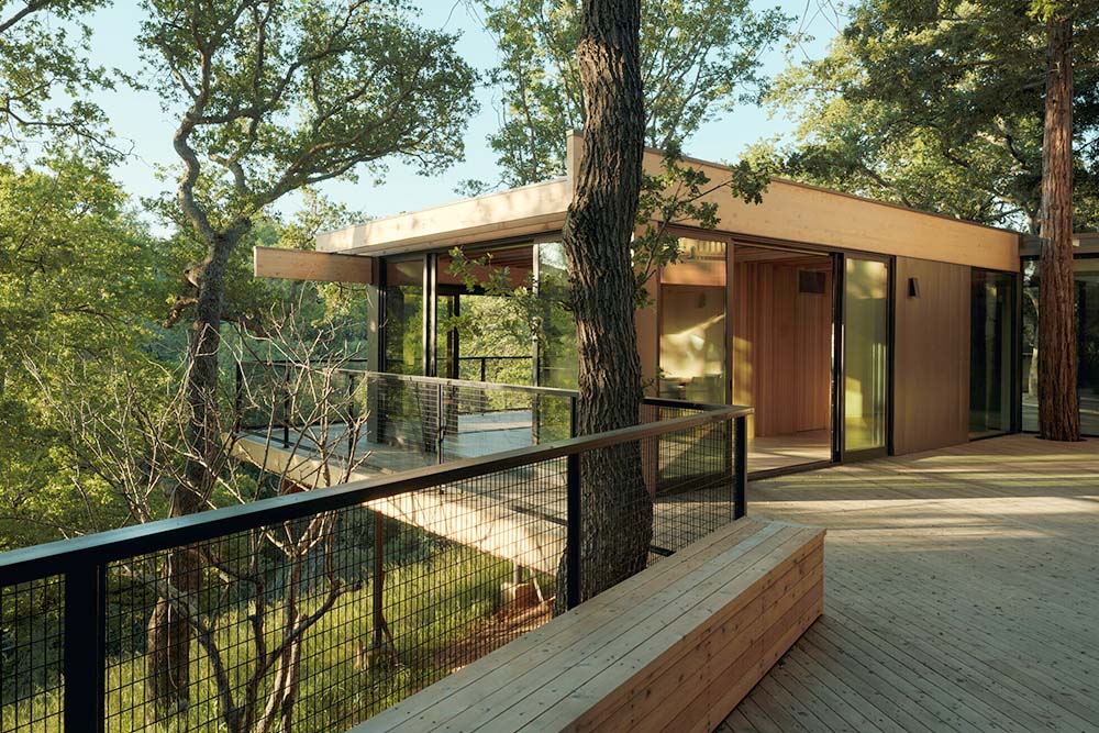 Onder de naam ‘Paviljoen in de eiken’, realiseerde Mork-Ulnes Architects een project in Monte Sereno, California (VS) dat een uitbreiding betreft van een woning op een heuvel uit de jaren ‘70. Het gebouw is tegenover de bestaande woning geplaatst. Hierdoor ontstaat een driezijdige, open binnenplaats die fungeert als de belangrijkste zomerontmoetingsplaats. Het paviljoen is ontworpen als een toevluchtsoord voor de eigenaar. Tevens fungeert het als een ontmoetingsplek. Daarbij biedt hij naast het gezinsleven ruimte voor yoga, beweging en wellness.