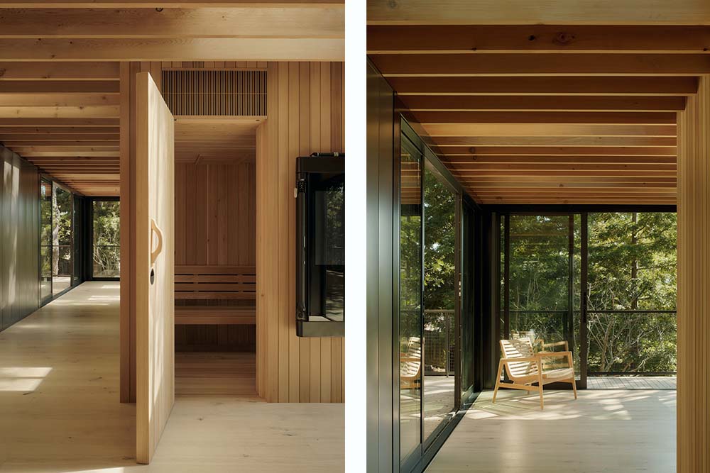 Het nieuwe paviljoen omvat een fitnessruimte, sauna, badkamer en flexibele entertainment- en yogaruimte. De laatste is via een brug verbonden met de bestaande, met stucwerk beklede buitenwijkwoning uit de jaren 70. ‘Paviljoen in de eiken’ is een nauwkeurige en doordachte uitvoering van de passie van Mork-Ulnes Architects voor ecologische bouw en de subtiele kunst van het bouwen met het landschap.