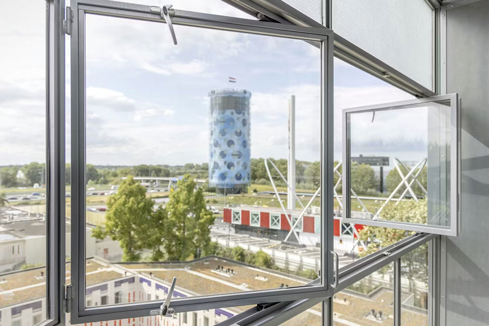 Aan de zijde van de snelweg is een geluidwerende gevel toegepast met beglazing die is gebaseerd op het Piraeus-systeem. Deze constructie fungeert tevens als extra verblijfsruimte in de vorm van een wintertuin. Daarnaast is de voormalige gymzaal herbestemd tot een multifunctionele ruimte voor onder meer theater en evenementen. In het complex zijn verder twee restaurants, vergaderruimtes, ateliers, werkplekken voor startups en pop-upwinkels opgenomen, die ook toegankelijk zijn voor de buurt.