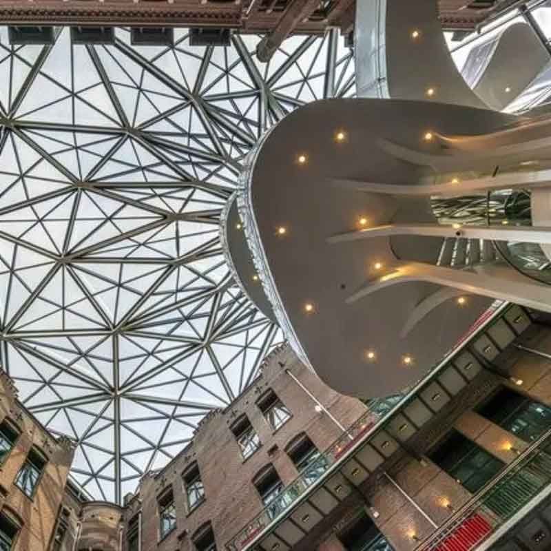 De open binnenplaats heeft een “glazen” overkapping gekregen waardoor eenheid wordt gecreëerd tussen de verschillende gebouwen. Een dakconstructie overspant de vide en strekt zich als een enorm blad uit over de bestaande gebouwen. Dit centrale atrium heeft een publieke functie waarin voor het onderwijs en onderzoek ontmoeten en interactie centraal staan.
