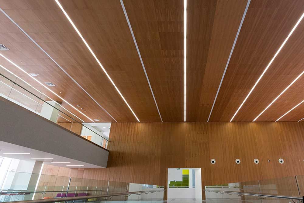 HunterDouglas - Het assortiment platen en panelen van gefineerd hout bestaat uit akoestische plafond- en wandelementen met een MDF-kern, bedekt met houtfineer. Kies uit standaardpanelen of ontwerp aangepaste paneelvormen voor een uniek aanzicht. Het brede aanbod aan fineren en afwerkingen past altijd bij het beoogde design. En met geperforeerde nan0-panelen kunt u hoge akoestische prestaties bereiken zonder afbreuk te doen aan de esthetische kwaliteit.