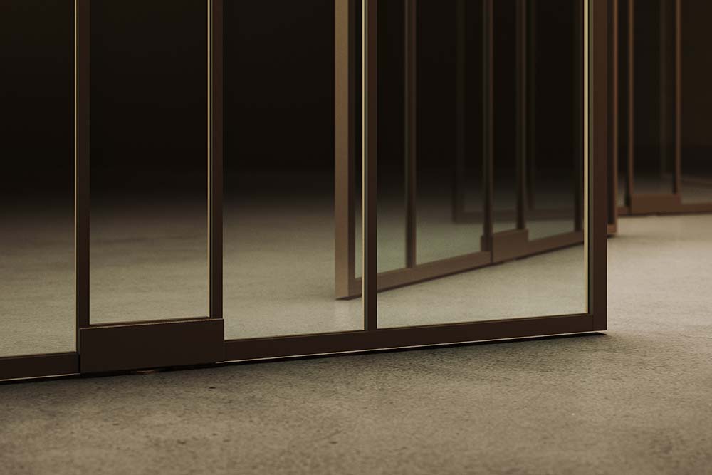 Het Pivotica-deurkader gebruikt dezelfde slanke profielen (35 mm) als de ingewerkte draai- en schuifdeuren in een divina-glaswand. De pivotdeur is beschikbaar in twee varianten: met het pivotscharnier in het onderprofiel van de deur ingewerkt (opbouw) of in de vloer verwerkt (inbouw). Het Softclose-systeem laat de pivotdeur automatisch afremmen bij het sluiten en bij het openen op 90°.