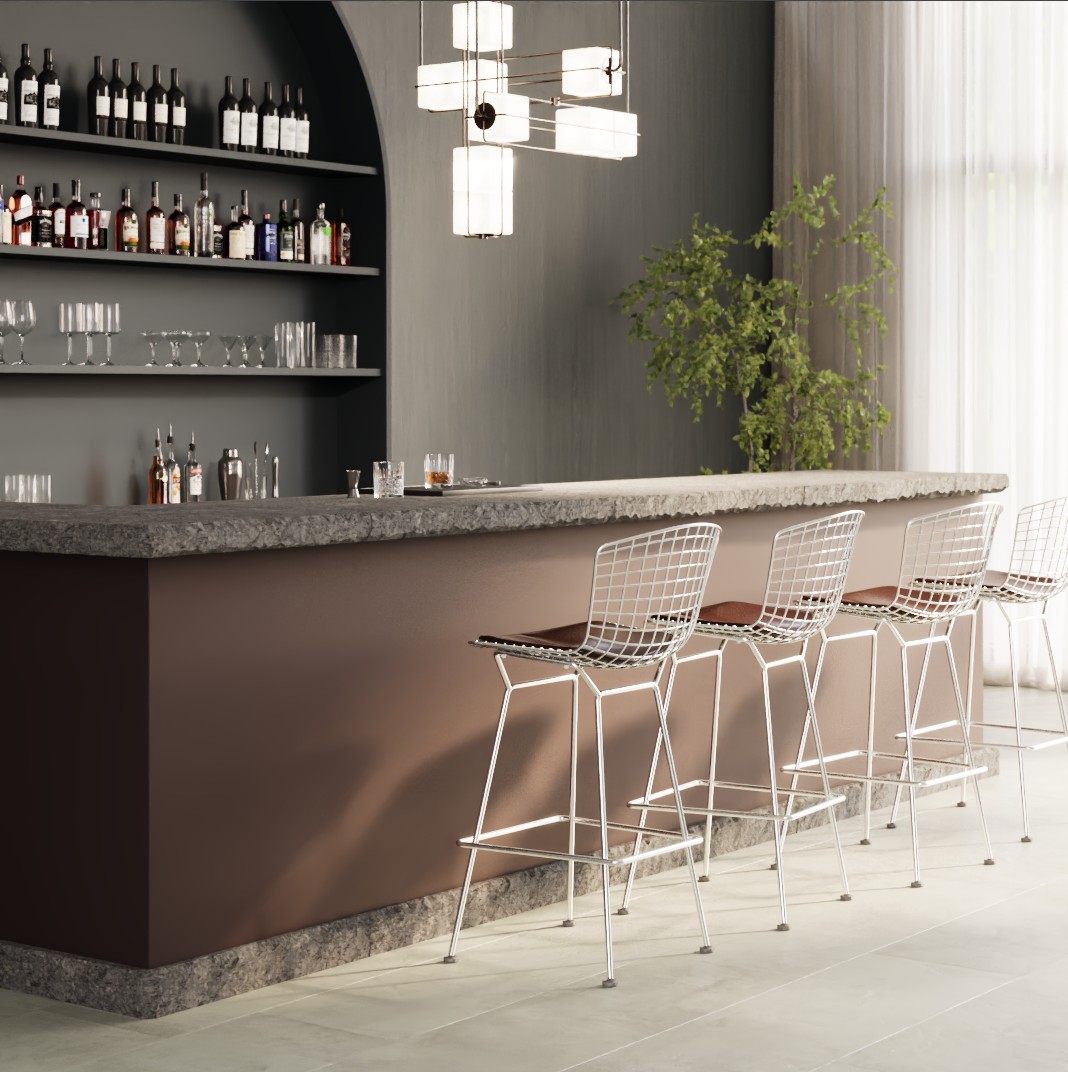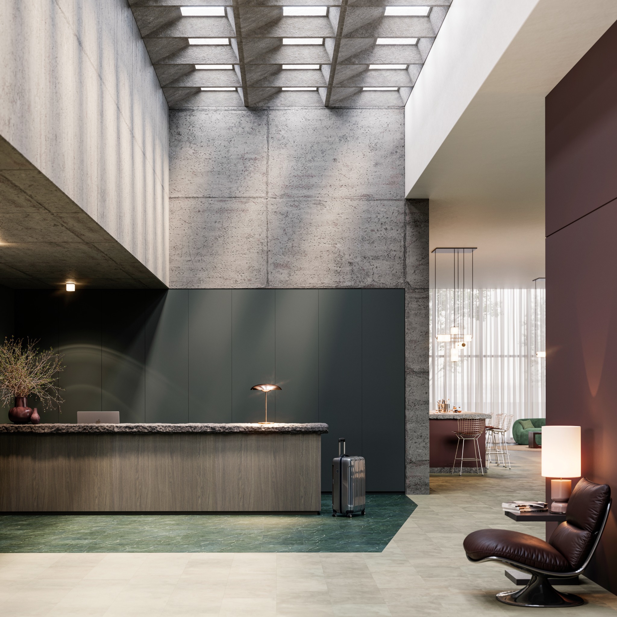 - Brutalistisch hotel. Een hotelinterieur dat speelt met contrasten: ruw beton tegenover rijke kleuraccenten. Master Oak green, Supermat mahogany en Supermat conifer brengen diepgang, karakter en een tikje drama. Ondersteund door Unilin-vloeren van Moduleo en Quick-Step.
