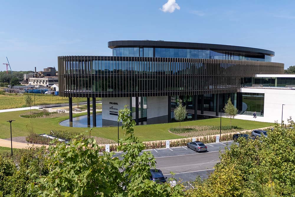In Ieper verrijst een nieuw herkenningspunt: het hoofdkantoor van Picanol Group. Een gebouw dat niet zomaar kantoren huisvest, maar een verhaal vertelt – van innovatie, precisie en licht. De elliptische spoelvorm, glanzend in goud, lijkt te ademen met het daglicht. Die levendige gevel dankt zijn karakter aan één subtiel maar bepalend element: de DucoSun Cubic lamellen van DUCO.